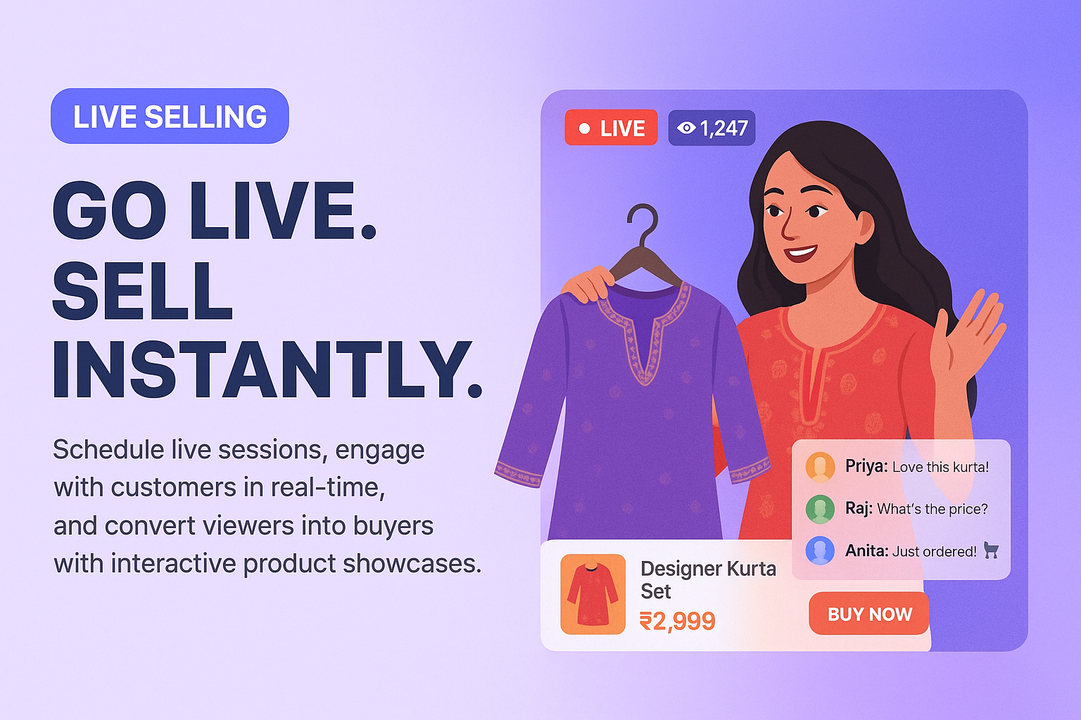 - • Live Selling Sessions with Real-Time Chat